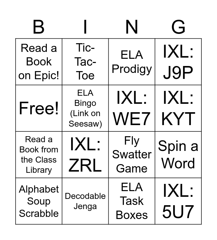 This bingo card has 16 words: Decodable Jenga, Spin a Word, ELA Prodigy, Read a Book on Epic!, Read a Book from the Class Library, Tic-Tac-Toe, Fly Swatter Game, ELA Task Boxes, Free!, ELA Bingo (Link on Seesaw), Alphabet Soup Scrabble, IXL: J9P, IXL: ZRL, IXL: KYT, IXL: WE7 and IXL: 5U7.