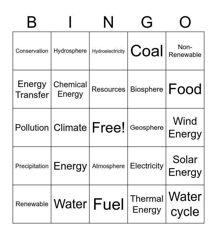 This bingo card has a free space and 24 words: Energy, Water, Resources, Renewable, Non-Renewable, Conservation, Energy Transfer, Hydrosphere, Geosphere, Atmosphere, Biosphere, Pollution, Electricity, Solar Energy, Chemical Energy, Thermal Energy, Wind Energy, Hydroelectricity, Food, Climate, Water cycle, Precipitation, Coal and Fuel.
