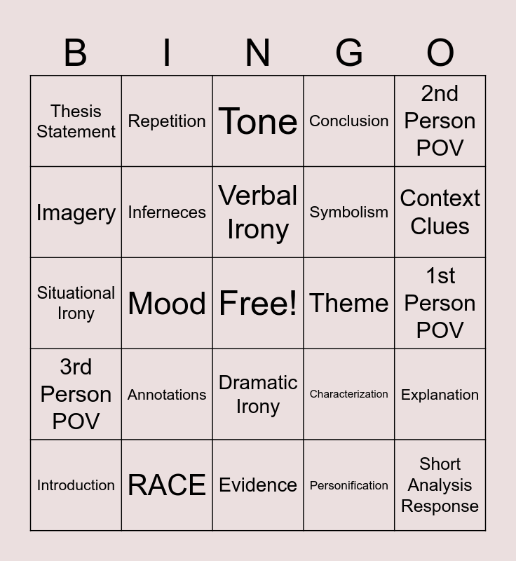 This bingo card has a free space and 24 words: Annotations, RACE, Verbal Irony, Introduction, 2nd Person POV, Thesis Statement, Imagery, Repetition, Theme, Dramatic Irony, Symbolism, Situational Irony, Characterization, Explanation, Inferneces, Personification, 1st Person POV, Tone, Context Clues, Mood, Short Analysis Response, 3rd Person POV, Conclusion and Evidence.