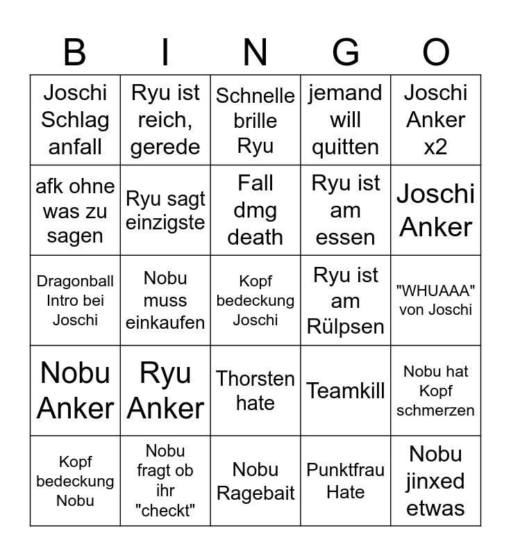 This bingo card has 25 words: Ryu Anker, Nobu Ragebait, Fall dmg death, Kopf bedeckung Nobu, Joschi Anker x2, Joschi Schlag anfall, afk ohne was zu sagen, Ryu ist reich, gerede, Ryu ist am Rülpsen, Thorsten hate, Ryu ist am essen, Dragonball Intro bei Joschi, Teamkill, Nobu hat Kopf schmerzen, Ryu sagt einzigste, Nobu jinxed etwas, "WHUAAA" von Joschi, Schnelle brille Ryu, Joschi Anker, Nobu muss einkaufen, Kopf bedeckung Joschi, Nobu fragt ob ihr "checkt", Nobu Anker, jemand will quitten and Punktfrau Hate.