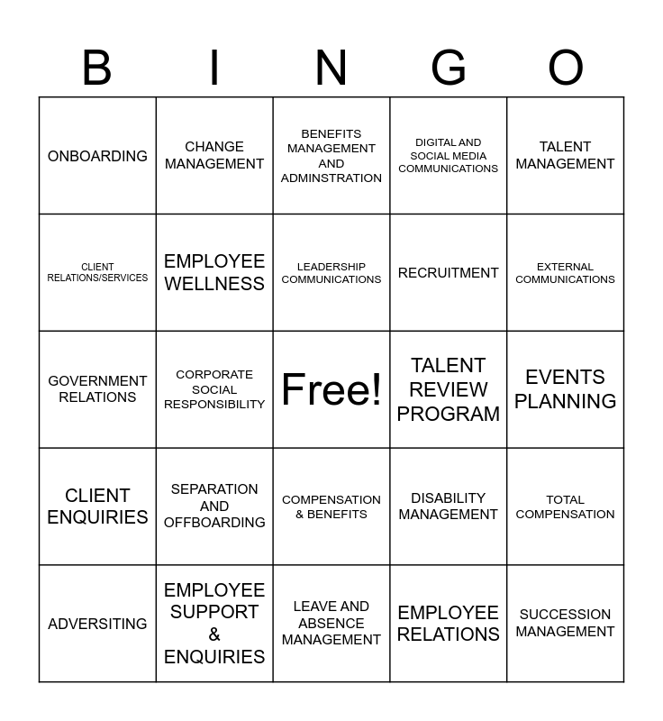 This bingo card has a free space and 56 words: PUBLIC RELATIONS, ADVERSITING, BRAND MANAGEMENT, ONBOARDING, LEAVE AND ABSENCE MANAGEMENT, HR MANAGEMENT SYSTEM & TECHNOLOGY, EMPLOYEE WELLNESS, EMPLOYEE RECORDS MANAGEMENT, RECRUITMENT, PAYROLL SUPPORT, DIGITAL AND SOCIAL MEDIA COMMUNICATIONS, ORGANIZATIONAL DEVELOPMENT, LEARNING AND DEVELOPMENT, STRATEGIC HUMAN RESOURCES, PERFORMANCE DEVELOPMENT, STRATEGIC COMMUNICATIONS, TALENT MANAGEMENT, CORPORATE SOCIAL RESPONSIBILITY, LEADERSHIP TRAINING AND DEVELOPMENT, SUCCESSION MANAGEMENT, TALENT REVIEW PROGRAM, LABOUR RELATIONS, DISABILITY MANAGEMENT, BENEFITS MANAGEMENT AND ADMINSTRATION, OCCUPATIONAL HEALTH AND SAFETY, LEADERSHIP COMMUNICATIONS, EMPLOYEE ENGAGEMENT COMMUNICATIONS, INTERNAL COMMUNICATIONS, EXTERNAL COMMUNICATIONS, HUMAN RESOURCE PLANNING, STAKEHOLDER ENGAGEMENT, DIVERSITY, EQUITY AND INCLUSION, MEDIA RELATIONS, PEOPLE & CULTURE COORDINATION, EVENTS PLANNING, CLIENT RELATIONS/SERVICES, GOVERNMENT RELATIONS, TRANSLATION SERVICES, CLIENT ENQUIRIES, CHANGE MANAGEMENT, COMPENSATION & BENEFITS, PEOPLE AND CULTURE METRICS AND REPORTING, EMPLOYEE ENGAGEMENT, EMPLOYEE ENGAGEMENT, EMPLOYEE EXPERIENCE, SEPARATION AND OFFBOARDING, EMPLOYEE SUPPORT & ENQUIRIES, CRISIS COMMUNICATION & ISSUES MANAGEMENT, EDITORIAL, EXTERNAL COMMUNICATION SUPPORT, EMPLOYEE RELATIONS, PEOPLE & CULTURE POLICIES, EMPLOYEE ENQUIRIES, WORKFORCE PLANNING, TOTAL COMPENSATION and CULTURE.