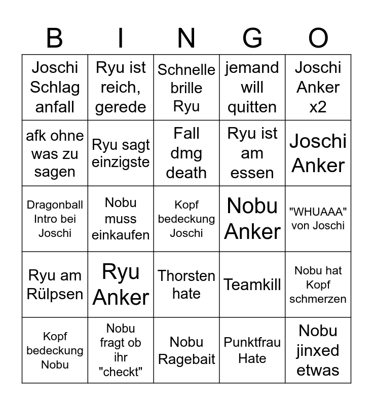 This bingo card has 25 words: Ryu Anker, Nobu Ragebait, Fall dmg death, Kopf bedeckung Nobu, Joschi Anker x2, Joschi Schlag anfall, afk ohne was zu sagen, Ryu ist reich, gerede, Nobu Anker, Thorsten hate, Ryu ist am essen, Dragonball Intro bei Joschi, Teamkill, Nobu hat Kopf schmerzen, Ryu sagt einzigste, Nobu jinxed etwas, "WHUAAA" von Joschi, Schnelle brille Ryu, Joschi Anker, Nobu muss einkaufen, Kopf bedeckung Joschi, Nobu fragt ob ihr "checkt", Ryu am Rülpsen, jemand will quitten and Punktfrau Hate.