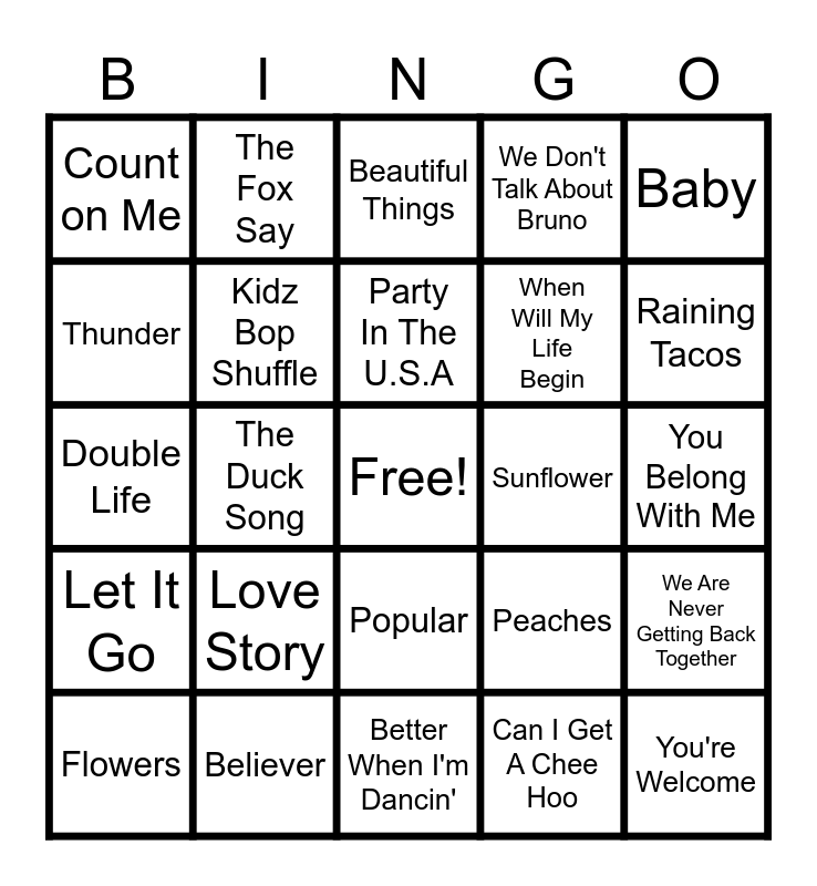 This bingo card has a free space and 25 words: Love Story, Better When I'm Dancin', Party In The U.S.A, Flowers, Baby, Count on Me, Thunder, The Fox Say, Sunflower, Popular, When Will My Life Begin, Double Life, Peaches, We Are Never Getting Back Together, Kidz Bop Shuffle, Cry, You Belong With Me, Beautiful Things, Raining Tacos, The Duck Song, You're Welcome, Believer, Let It Go, We Don't Talk About Bruno and Can I Get A Chee Hoo.