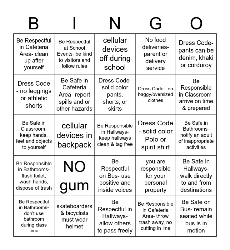This bingo card has 25 words: NO gum, Be Respectful in Hallways- allow others to pass freely, Dress Code- solid color pants, shorts, or skirts, Be Respectful in Bathrooms- don’t use bathroom during class time, Dress Code- pants can be denim, khaki or corduroy, Be Respectful in Cafeteria Area- clean up after yourself, Dress Code - no leggings or athletic shorts, Be Respectful at School Events- be kind to visitors and follow rules, Dress Code - solid color Polo or spirit shirt, Be Respectful on Bus- use positive and inside voices, Dress Code - no baggy/oversized clothes, Be Safe in Classroom- keep hands, feet and objects to yourself, you are responsible for your personal property, Be Safe in Hallways- walk directly to and from destinations, Be Safe in Cafeteria Area- report spills and or other hazards, Be Safe on Bus- remain seated while bus is in motion, Be Safe in Bathrooms- notify an adult of inappropriate activities, cellular devices off during school, Be Responsible in Classroom- arrive on time & prepared, cellular devices in backpack, Be Responsible in Hallways- keep hallways clean & tag free, skateboarders & bicyclists must wear helmet, Be Responsible in Bathrooms- flush toilet, wash hands, dispose of trash, No food deliveries- parent or delivery service and Be Responsible in Cafeteria Area- throw trash away, no cutting in line.