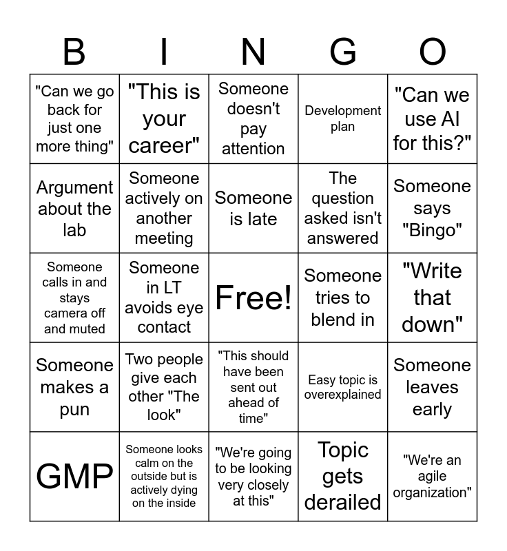 This bingo card has a free space and 29 words: GMP, Someone makes a good point that is ignored, Someone in LT avoids eye contact, Each person around the room is asked for opinion, "Can we go back for just one more thing", Someone doesn't pay attention, Someone actively on another meeting, Two people give each other "The look", Someone tries to blend in, Someone looks calm on the outside but is actively dying on the inside, "Write that down", "We're an agile organization", "We're going to be looking very closely at this", Topic gets derailed, Someone says "Bingo", Not prepared for their agenda topic, "This should have been sent out ahead of time", Someone makes a pun, "Can we use AI for this?", Someone calls in and stays camera off and muted, Easy topic is overexplained, "This should be a topic for next meeting", The question asked isn't answered, Argument about the lab, Development plan, "This is your career", Someone leaves early, Someone is late and Someone cries.