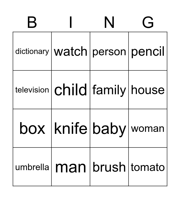 This bingo card has 16 words: man, woman, person, dictionary, box, watch, baby, brush, television, child, umbrella, pencil, knife, house, family and tomato.