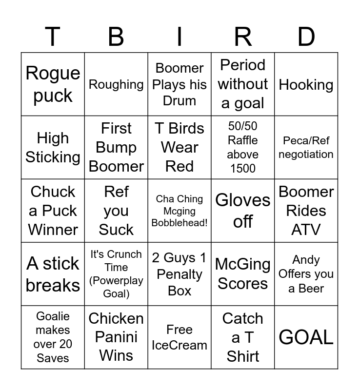 This bingo card has a free space and 24 words: It's Crunch Time (Powerplay Goal), Chicken Panini Wins, T Birds Wear Red, Goalie makes over 20 Saves, Hooking, Rogue puck, High Sticking, Roughing, Gloves off, 2 Guys 1 Penalty Box, 50/50 Raffle above 1500, Chuck a Puck Winner, McGing Scores, Andy Offers you a Beer, First Bump Boomer, Catch a T Shirt, Boomer Rides ATV, Boomer Plays his Drum, Peca/Ref negotiation, Ref you Suck, GOAL, A stick breaks, Period without a goal and Free IceCream.