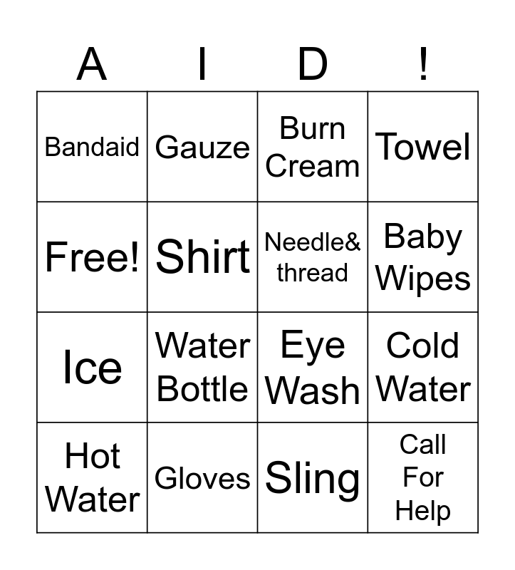 This bingo card has 16 words: Gloves, Cold Water, Burn Cream, Bandaid, Ice, Gauze, Eye Wash, Sling, Free!, Shirt, Hot Water, Towel, Water Bottle, Baby Wipes, Needle& thread and Call For Help.