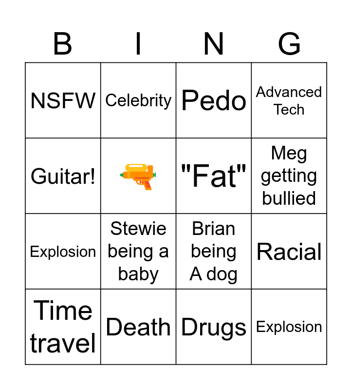This bingo card has 16 words: Death, Racial, Pedo, NSFW, Explosion, Celebrity, Brian being A dog, Drugs, Guitar!, 🔫, Time travel, Advanced Tech, Stewie being a baby, Meg getting bullied, "Fat" and Explosion.