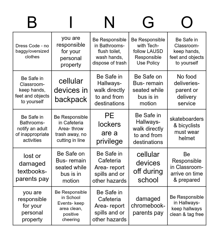 This bingo card has 25 words: Be Safe on Bus- remain seated while bus is in motion, Be Safe in Cafeteria Area- report spills and or other hazards, Be Safe in Hallways- walk directly to and from destinations, you are responsible for your personal property, Be Safe in Classroom- keep hands, feet and objects to yourself, Dress Code - no baggy/oversized clothes, Be Safe in Classroom- keep hands, feet and objects to yourself, you are responsible for your personal property, Be Safe in Hallways- walk directly to and from destinations, Be Safe in Cafeteria Area- report spills and or other hazards, Be Safe on Bus- remain seated while bus is in motion, Be Safe in Bathrooms- notify an adult of inappropriate activities, cellular devices off during school, Be Responsible in Classroom- arrive on time & prepared, cellular devices in backpack, Be Responsible in Hallways- keep hallways clean & tag free, skateboarders & bicyclists must wear helmet, Be Responsible in Bathrooms- flush toilet, wash hands, dispose of trash, No food deliveries- parent or delivery service, Be Responsible in Cafeteria Area- throw trash away, no cutting in line, PE lockers are a privilege, Be Responsible in School Events- keep area clean, positive cheering, lost or damaged textbooks- parents pay, Be Responsible with Tech- follow LAUSD Responsible Use Policy and damaged chromebook- parents pay.