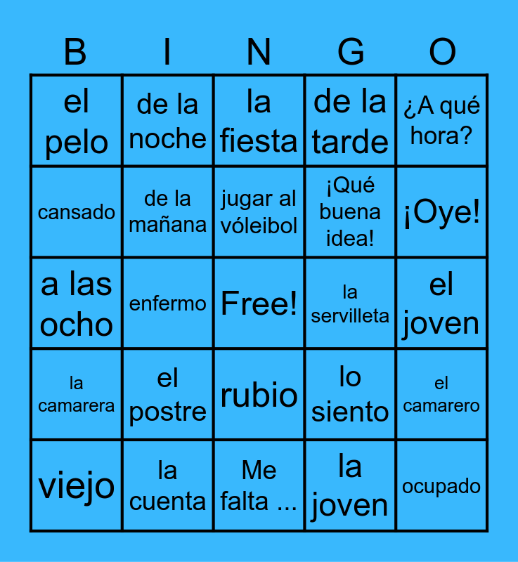 This bingo card has a free space and 77 words: el baile, el concierto, la fiesta, el partido, ir de cámping, ir de pesca, jugar al básquetbol, jugar al béisbol, jugar al fútbol, jugar al fútbol americano, jugar al golf, jugar al tenis, jugar al vóleibol, cansado, contento, enfermo, mal, ocupado, triste, ¿A qué hora?, a la una, a las ocho, de la mañana, de la noche, de la tarde, este fin de semana, esta noche, esta tarde, conmigo, contigo, entre, ¡Ay! ¡Qué pena!, ¡Genial!, lo siento, ¡Oye!, ¡Qué buena idea!, el hombre, la mujer, el joven, la joven, alto, bajo, corto, guapo, joven, largo, viejo, el pelo, canoso, castaño, negro, rubio, pelirrojo, tener calor, tener frio, tener sueño, delicioso, desear, pedir, el plato principal, el postre, el azúcar, la cuchara, el cuchillo, la pimienta, el plato, la sal, la servilleta, la taza, el tenedor, el vaso, el camarero, la camarera, la cuenta, el menú, Me falta ... and Quisiera.