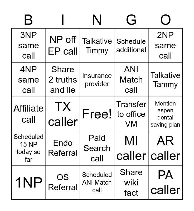 This bingo card has a free space and 24 words: Endo Referral, OS Referral, Insurance provider, 1NP, 2NP same call, 3NP same call, 4NP same call, NP off EP call, Transfer to office VM, Paid Search call, ANI Match call, Affiliate call, MI caller, AR caller, Share 2 truths and lie, Share wiki fact, Mention aspen dental saving plan, Talkative Timmy, Talkative Tammy, TX caller, PA caller, Scheduled 15 NP today so far, Schedule additional and Scheduled ANI Match call.