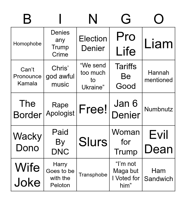 This bingo card has a free space and 24 words: Paid By DNC, Harry Goes to be with the Peloton, “We send too much to Ukraine”, Wife Joke, Liam, Homophobe, Can’t Pronounce Kamala, Denies any Trump Crime, Jan 6 Denier, Slurs, Tariffs Be Good, The Border, Woman for Trump, Evil Dean, Chris’ god awful music, “I’m not Maga but I Voted for him”, Numbnutz, Election Denier, Hannah mentioned, Rape Apologist, Ham Sandwich, Wacky Dono, Pro Life and Transphobe.