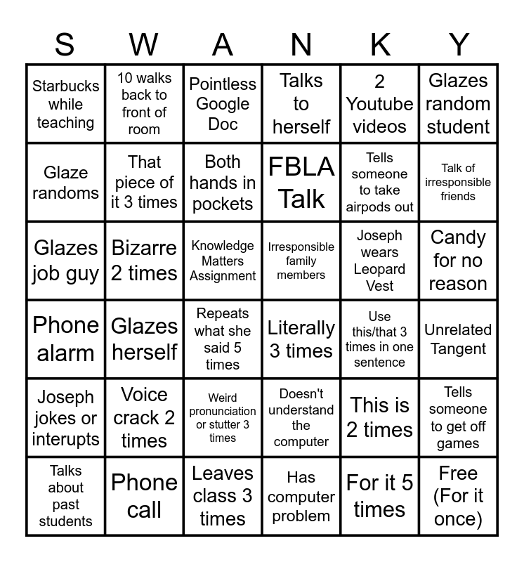 This bingo card has 42 words: For it 5 times, That piece of it 3 times, Travel Talk, Joseph wears Leopard Vest, Unrelated Tangent, Glazes herself, Glazes job guy, Basically 10 times, Pointless Google Doc, Candy for no reason, Knowledge Matters Assignment, FBLA Talk, Talk of irresponsible friends, 2 Youtube videos, Phone call, Phone alarm, Tells someone to get off games, Tells someone to take airpods out, Free (For it once), 10 walks back to front of room, Glazes random student, Weird pronunciation or stutter 3 times, Joseph jokes or interupts, Starbucks while teaching, So I tell people, Talks about past students, Both hands in pockets, Incorrect grammar, Voice crack 2 times, This is 2 times, Put phones up, Irresponsible family members, Glaze randoms, Use this/that 3 times in one sentence, Leaves class 3 times, Repeats what she said 5 times, Literally 3 times, Bizarre 2 times, Doesn't understand the computer, Has computer problem, Talks to herself and IT at the end 10 times.