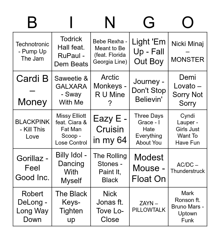 This bingo card has 74 words: Free!, Cardi B - Bodak Yellow, Bebe Rexha - Meant to Be (feat. Florida Georgia Line), Bishop-River, Katy Perry – Roar, N.E.R.D & Rihanna – Lemon, Selena Gomez - Hands To Myself, Kendrick Lamar - HUMBLE., Robert DeLong - Long Way Down, 5 Seconds Of Summer – Youngblood, Jessie J ft. Ariana Grande, Nicki Minaj - Bang Bang, Lizzo - Truth Hurts, Arctic Monkeys - R U Mine ?, Cardi B – Money, Todrick Hall – Expensive, Missy Elliott feat. Ciara & Fat Man Scoop - Lose Control, Mark Ronson ft. Bruno Mars - Uptown Funk, Demi Lovato – Sorry Not Sorry, TWENTY ONE PILOTS - Tear In My Heart, BLACKPINK - Kill This Love, Saweetie & GALXARA - Sway With Me, Todrick Hall feat. RuPaul - Dem Beats, Light 'Em Up - Fall Out Boy, Fall Out Boy - Uma Thurman, Eazy E - Cruisin in my 64, AJR – Bang, Burn The House Down – AJR, P!NK - Raise Your Glass, Saweetie ft. Doja - Best Friend, Talking Body – Tove Lo, Nicki Minaj – MONSTER, OneRepublic - Counting Stars, Tones and I - Dance Monkey, Sam Smith ft Kim Petras- Unholy, The Revivalists - Wish I Knew You, ZAYN – PILLOWTALK, Benson Boone - Beautiful Things, Hozier - Too Sweet, BabyJake - Cigarettes On Patios, BØRNS - Electric Love, Nick Jonas ft. Tove Lo- Close, The Black Keys- Tighten up, Thomas Rhett - Crash And Burn, alt-J (∆) Breezeblocks, Sam Tinnesz – Bloodshot, Technotronic - Pump Up The Jam, Vanilla Ice - Ice Ice Baby, Billy Idol - Dancing With Myself, The B-52's - Love Shack, Salt-N-Pepa - Push It, M.C. Hammer - U Can't Touch This, DEF LEPPARD - Pour Some Sugar On Me, Cyndi Lauper - Girls Just Want To Have Fun, Deniece Williams - Let's Hear It for the Boy, AC/DC - You Shook Me All Night Long, Whitney Houston - I Wanna Dance With Somebody, The Rolling Stones - Paint It, Black, Heart - "Barracuda, BLACK SABBATH - "Paranoid, AC/DC – Thunderstruck, Journey - Don't Stop Believin', I'm Shipping Up To Boston - Dropkick Murphys, Gorillaz - Feel Good Inc., Panic! At The Disco: I Write Sins Not Tragedies, Three Days Grace - I Hate Everything About You, blink-182 - All The Small Things, Fall Out Boy - Thnks fr th Mmrs, Jet - Are You Gonna Be My Girl, Modest Mouse - Float On, Yeah Yeah Yeahs - Heads Will Roll, Luke Bryan - Country Girl (Shake It For Me), Brooks & Dunn - Boot Scootin' Boogie, Walker Hayes - Fancy Like and Chappell Roan - Pink Pony Club.