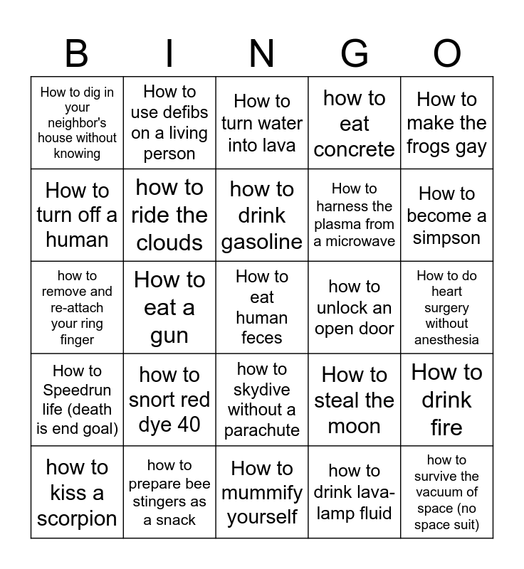 This bingo card has a free space and 24 words: how to snort red dye 40, how to prepare bee stingers as a snack, how to drink gasoline, how to kiss a scorpion, How to make the frogs gay, How to dig in your neighbor's house without knowing, How to turn off a human, How to use defibs on a living person, how to unlock an open door, how to skydive without a parachute, How to harness the plasma from a microwave, how to remove and re-attach your ring finger, How to steal the moon, How to drink fire, how to ride the clouds, how to drink lava-lamp fluid, How to do heart surgery without anesthesia, How to turn water into lava, How to become a simpson, How to eat a gun, how to survive the vacuum of space (no space suit), How to Speedrun life (death is end goal), how to eat concrete and How to mummify yourself.