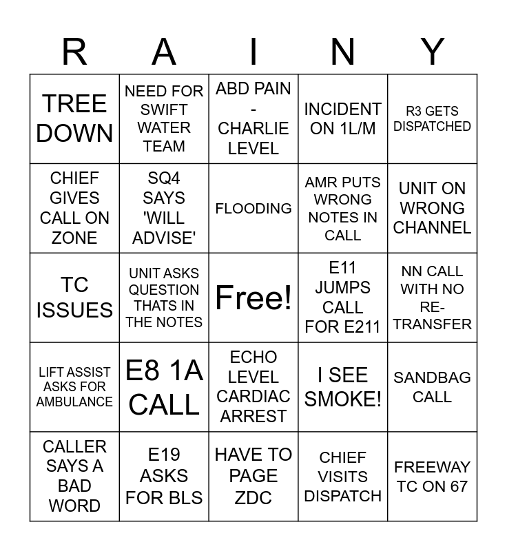 This bingo card has a free space and 24 words: E8 1A CALL, E19 ASKS FOR BLS, FLOODING, CALLER SAYS A BAD WORD, R3 GETS DISPATCHED, TREE DOWN, CHIEF GIVES CALL ON ZONE, NEED FOR SWIFT WATER TEAM, E11 JUMPS CALL FOR E211, ECHO LEVEL CARDIAC ARREST, AMR PUTS WRONG NOTES IN CALL, TC ISSUES, I SEE SMOKE!, SANDBAG CALL, SQ4 SAYS 'WILL ADVISE', CHIEF VISITS DISPATCH, NN CALL WITH NO RE-TRANSFER, ABD PAIN - CHARLIE LEVEL, UNIT ON WRONG CHANNEL, UNIT ASKS QUESTION THATS IN THE NOTES, FREEWAY TC ON 67, LIFT ASSIST ASKS FOR AMBULANCE, INCIDENT ON 1L/M and HAVE TO PAGE ZDC.