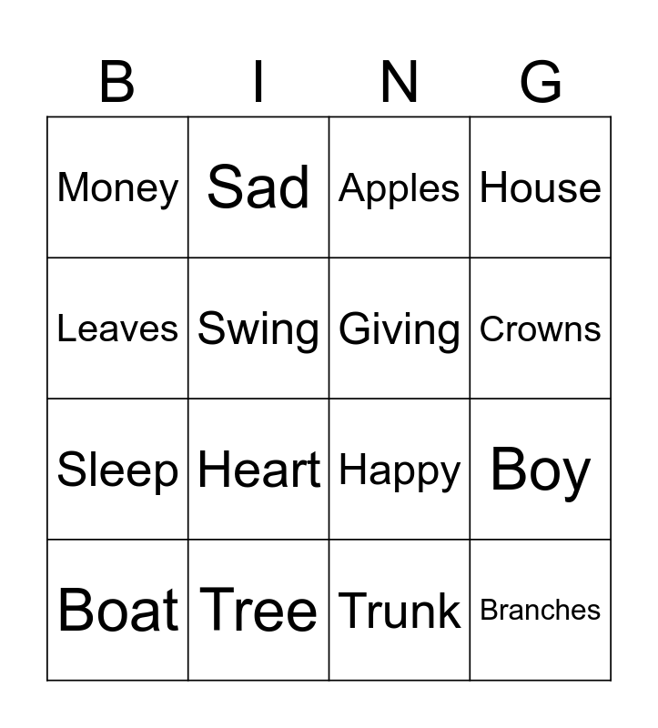 This bingo card has 16 words: Tree, Boy, Apples, Money, Sleep, Sad, Happy, Trunk, Leaves, Swing, Boat, House, Heart, Crowns, Giving and Branches.