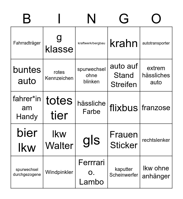 This bingo card has 25 words: lkw Walter, Ferrrari o. Lambo, spurwechsel ohne blinken, spurwechsel durchgezogene, autotransporter, Fahrradträger, buntes auto, g klasse, flixbus, gls, auto auf Stand Streifen, fahrer*in am Handy, Frauen Sticker, rechtslenker, rotes Kennzeichen, lkw ohne anhänger, franzose, kraftwerk/bergbau, extrem hässliches auto, totes tier, hässliche Farbe, Windpinkler, bier lkw, krahn and kaputter Scheinwerfer.