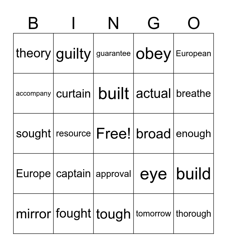 This bingo card has a free space and 29 words: mirror, vocabulary, resource, course, theory, guarantee, curtain, captain, broad, fought, enough, thorough, tough, tomorrow, breathe, measure, approval, Europe, European, sought, eye, actually, actual, accompany, obey, guilty, build, built and cousin.