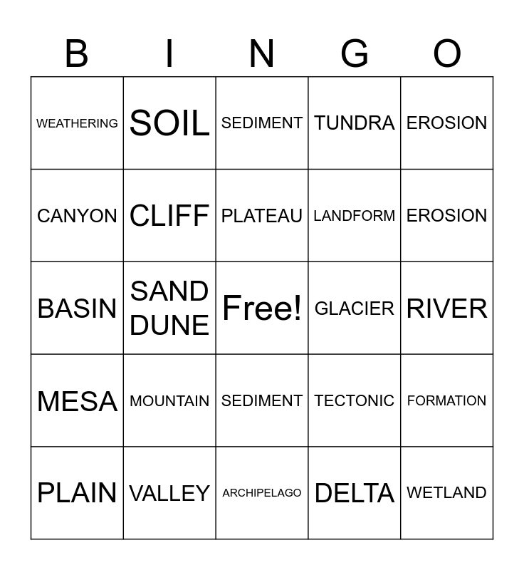 This bingo card has a free space and 24 words: MOUNTAIN, VALLEY, PLATEAU, PLAIN, EROSION, WEATHERING, CANYON, SOIL, GLACIER, SEDIMENT, LANDFORM, BASIN, TECTONIC, FORMATION, CLIFF, DELTA, RIVER, SEDIMENT, EROSION, SAND DUNE, WETLAND, MESA, TUNDRA and ARCHIPELAGO.