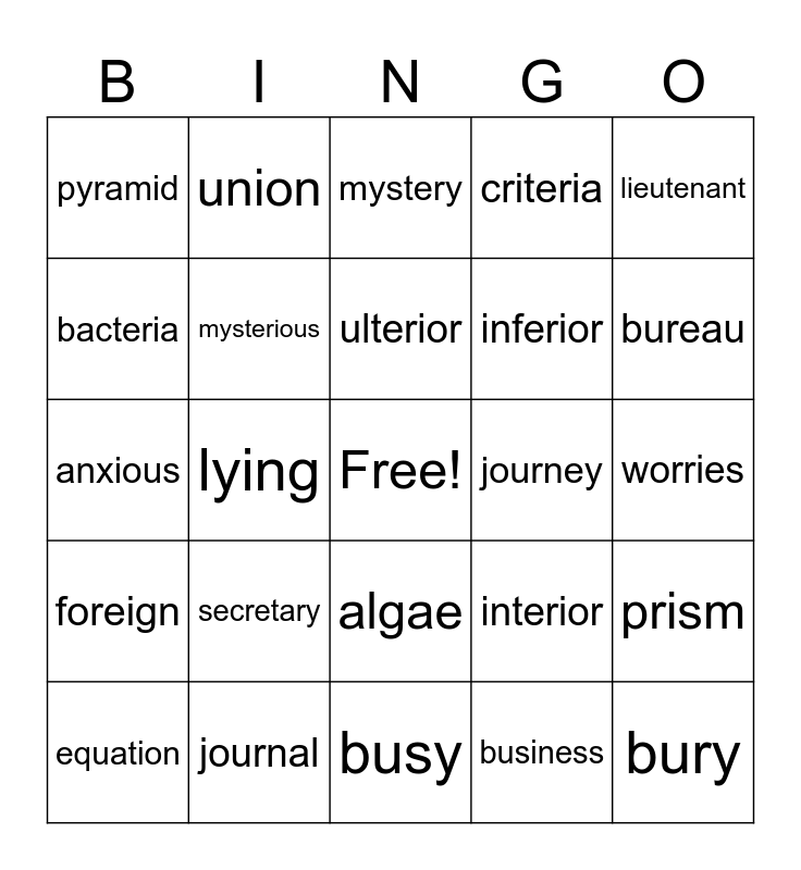 This bingo card has a free space and 29 words: equation, dying, lying, oxygen, pyramid, mystery, mysterious, secretary, journey, journal, worries, bury, busy, business, bureau, height, algae, foreign, lieutenant, anxious, interior, exterior, inferior, bacteria, criteria, union, prism, ulterior and anxiety.
