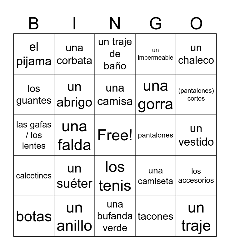 This bingo card has a free space and 36 words: la ropa, lleva, llevo, un abrigo, una camiseta, calcetines, una camisa, zapatos, un chaleco, una chaqueta, una falda, un impermeable, jeans, pantalones, (pantalones) cortos, el pijama, ropa interior, un suéter, un traje, un traje de baño, un vestido, los accesorios, un anillo, botas, una bufanda verde, una corbata, las gafas / los lentes, gafas de sol, una gorra, los guantes, medias, sandalias, tacones, los tenis, una blusa and una pulsera.