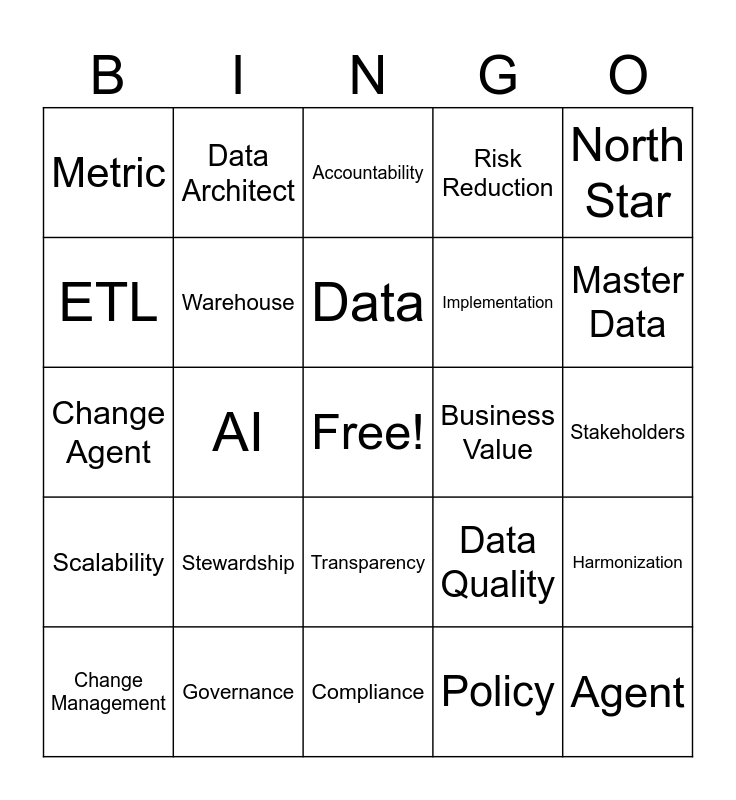 This bingo card has a free space and 24 words: Stewardship, Governance, Data, Change Management, North Star, Metric, ETL, Data Architect, Business Value, Transparency, Implementation, Change Agent, Data Quality, Harmonization, Warehouse, Policy, Stakeholders, Accountability, Master Data, AI, Agent, Scalability, Risk Reduction and Compliance.