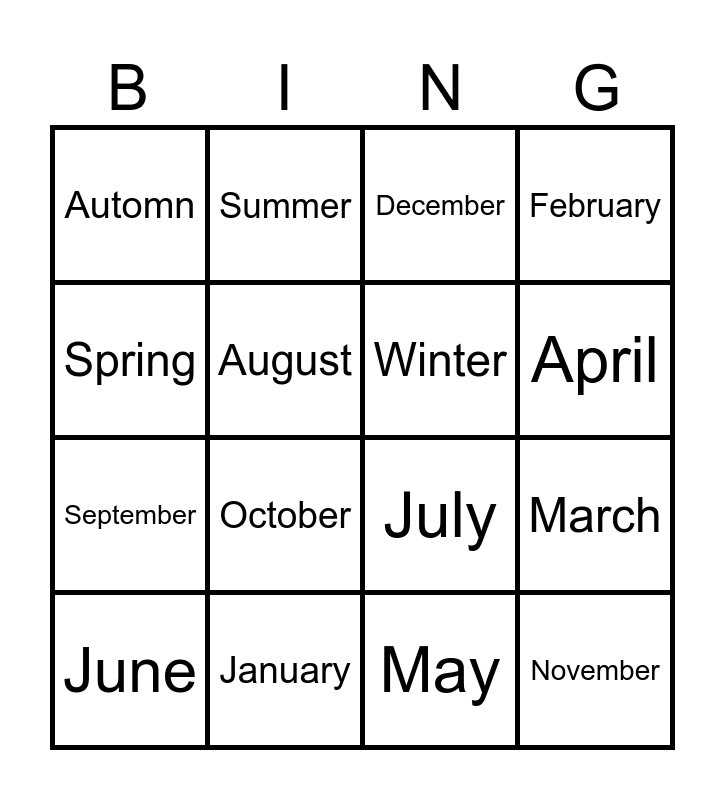 This bingo card has 16 words: January, March, December, Automn, September, Summer, July, May, Spring, August, June, February, October, April, Winter and November.