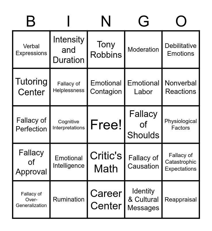 This bingo card has a free space and 24 words: Emotional Intelligence, Rumination, Emotional Contagion, Fallacy of Over-Generalization, Debilitative Emotions, Verbal Expressions, Tutoring Center, Intensity and Duration, Fallacy of Shoulds, Critic's Math, Emotional Labor, Fallacy of Perfection, Fallacy of Causation, Fallacy of Catastrophic Expectations, Fallacy of Helplessness, Identity & Cultural Messages, Physiological Factors, Tony Robbins, Nonverbal Reactions, Cognitive Interpretations, Reappraisal, Fallacy of Approval, Moderation and Career Center.