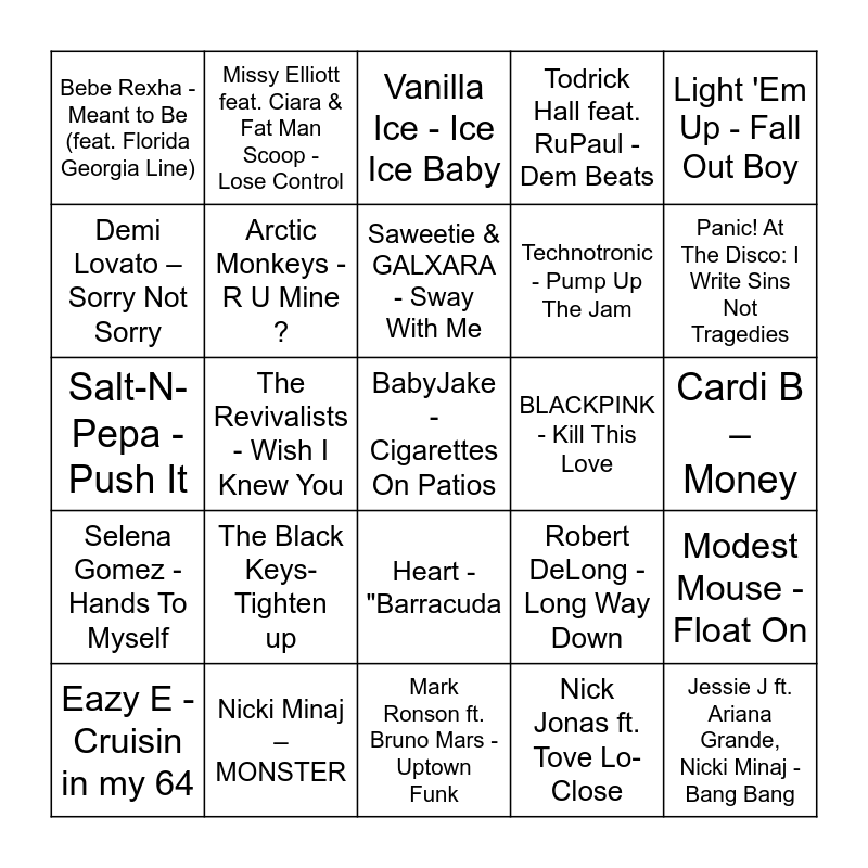 This bingo card has 73 words: Chappell Roan - Pink Pony Club, Cardi B - Bodak Yellow, Bebe Rexha - Meant to Be (feat. Florida Georgia Line), Bishop-River, Katy Perry – Roar, N.E.R.D & Rihanna – Lemon, Selena Gomez - Hands To Myself, Kendrick Lamar - HUMBLE., Robert DeLong - Long Way Down, 5 Seconds Of Summer – Youngblood, Jessie J ft. Ariana Grande, Nicki Minaj - Bang Bang, Lizzo - Truth Hurts, Arctic Monkeys - R U Mine ?, Cardi B – Money, Todrick Hall – Expensive, Missy Elliott feat. Ciara & Fat Man Scoop - Lose Control, Mark Ronson ft. Bruno Mars - Uptown Funk, Demi Lovato – Sorry Not Sorry, TWENTY ONE PILOTS - Tear In My Heart, BLACKPINK - Kill This Love, Saweetie & GALXARA - Sway With Me, Todrick Hall feat. RuPaul - Dem Beats, Light 'Em Up - Fall Out Boy, Fall Out Boy - Uma Thurman, Eazy E - Cruisin in my 64, Bang - AJR, Burn The House Down – AJR, Raise Your Glass - P!NK, Best Friend -Saweetie ft. Doja, Talking Body – Tove Lo, Nicki Minaj – MONSTER, OneRepublic - Counting Stars, Tones and I - Dance Monkey, Sam Smith ft Kim Petras- Unholy, The Revivalists - Wish I Knew You, ZAYN – PILLOWTALK, Benson Boone - Beautiful Things, Too Sweet -Hozier, BabyJake - Cigarettes On Patios, BØRNS - Electric Love, Nick Jonas ft. Tove Lo- Close, The Black Keys- Tighten up, Thomas Rhett - Crash And Burn, alt-J (∆) Breezeblocks, Sam Tinnesz – Bloodshot, Technotronic - Pump Up The Jam, Vanilla Ice - Ice Ice Baby, Billy Idol - Dancing With Myself, The B-52's - Love Shack, Salt-N-Pepa - Push It, M.C. Hammer - U Can't Touch This, DEF LEPPARD - Pour Some Sugar On Me, Cyndi Lauper - Girls Just Want To Have Fun, Deniece Williams - Let's Hear It for the Boy, AC/DC - You Shook Me All Night Long, Whitney Houston - I Wanna Dance With Somebody, The Rolling Stones - Paint It, Black, Heart - "Barracuda, BLACK SABBATH - "Paranoid, AC/DC – Thunderstruck, Journey - Don't Stop Believin', I'm Shipping Up To Boston - Dropkick Murphys, Gorillaz - Feel Good Inc., Panic! At The Disco: I Write Sins Not Tragedies, Three Days Grace - I Hate Everything About You, blink-182 - All The Small Things, Fall Out Boy - Thnks fr th Mmrs, Jet - Are You Gonna Be My Girl, Modest Mouse - Float On, Yeah Yeah Yeahs - Heads Will Roll, Luke Bryan - Country Girl (Shake It For Me), Boot Scootin' Boogie - Brooks & Dunn and Fancy Like -Walker Hayes.