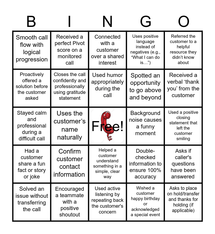 This bingo card has a free space and 24 words: Solved an issue without transferring the call, Confirm customer contact information, Used humor appropriately during the call, Wished a customer happy birthday or acknowledged a special event, Referred the customer to a helpful resource they didn’t know about, Smooth call flow with logical progression, Received a perfect Pivot score on a monitored call, Connected with a customer over a shared interest, Background noise causes a funny moment, Used a positive closing statement that left the customer smiling, Stayed calm and professional during a difficult call, Closes the call confidently and professionally using gratitude statement, Double-checked information to ensure 100% accuracy, Asks if caller's questions have been answered, Proactively offered a solution before the customer asked, Encouraged a teammate with a positive shoutout, Used active listening by repeating back the customer's concern, Uses positive language instead of negatives (e.g., “What I can do is…”), Received a verbal ‘thank you’ from the customer, Had a customer share a fun fact or story or joke, Uses the customer’s name naturally, Helped a customer understand something in a simple, clear way, Spotted an opportunity to go above and beyond and Asks to place on hold/transfer and thanks for holding (if applicable).