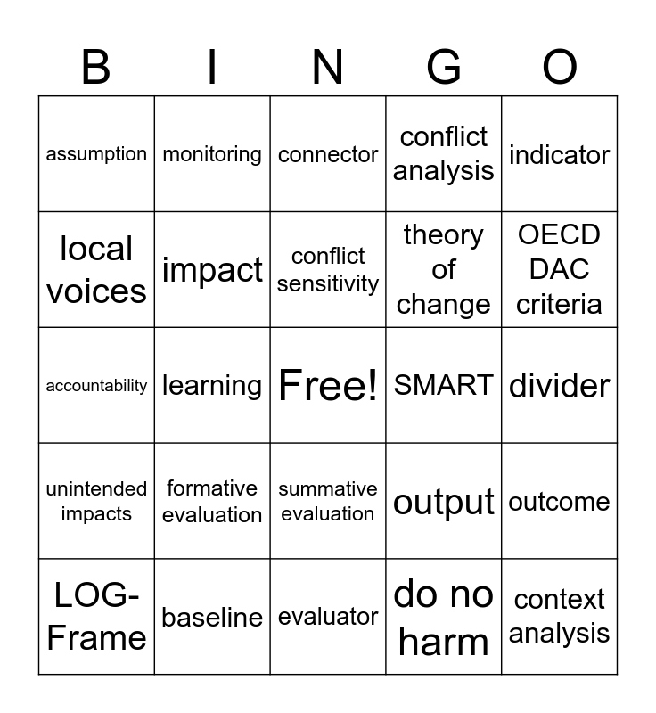 This bingo card has a free space and 24 words: formative evaluation, baseline, conflict sensitivity, LOG-Frame, indicator, assumption, local voices, monitoring, SMART, summative evaluation, theory of change, accountability, output, outcome, impact, do no harm, divider, connector, OECD DAC criteria, learning, context analysis, unintended impacts, conflict analysis and evaluator.