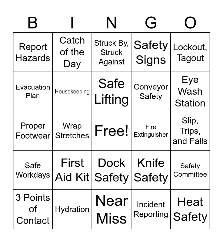 This bingo card has a free space and 24 words: First Aid Kit, Hydration, Safe Lifting, 3 Points of Contact, Lockout, Tagout, Report Hazards, Evacuation Plan, Catch of the Day, Fire Extinguisher, Dock Safety, Conveyor Safety, Proper Footwear, Knife Safety, Safety Committee, Housekeeping, Incident Reporting, Slip, Trips, and Falls, Struck By, Struck Against, Eye Wash Station, Wrap Stretches, Heat Safety, Safe Workdays, Safety Signs and Near Miss.