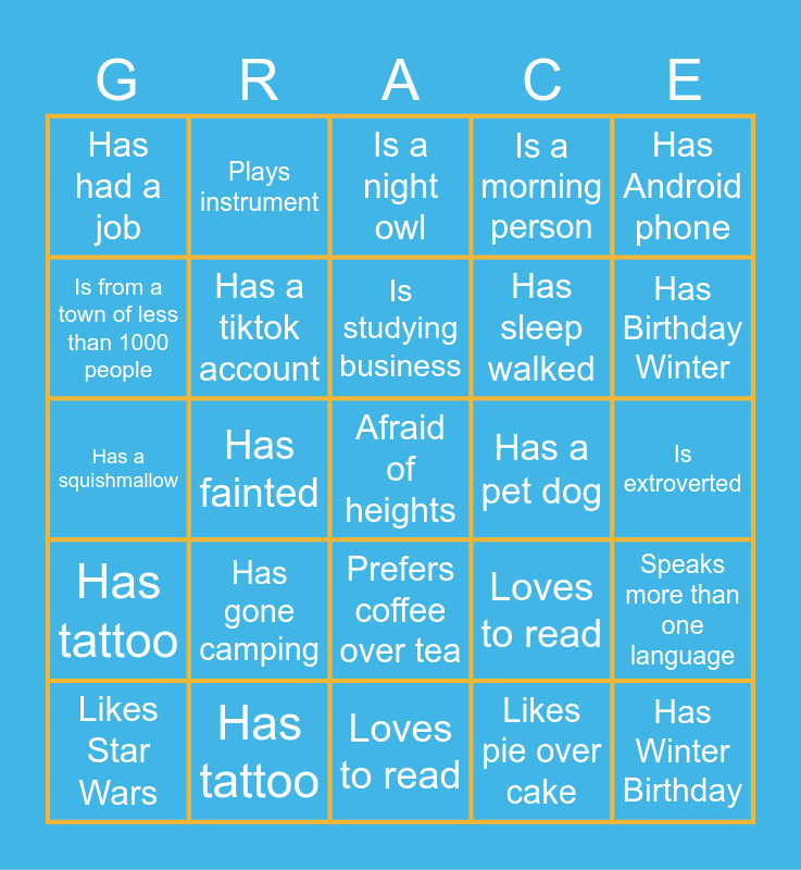 ⚠ This card has duplicate items: Owns a car (2), Has their license (2), Has a pet dog (2), Plays on a sports team (2), Has had a job (2), From another state/country (2), Is 10-20 minutes from campus (2), Has allergies (2), Met a celebrity (2), Has gone camping (2), Has gone a roller coaster (2), Been to Disneyland (2), Been to the beach (2), Been out of the country (2), Has more than 3 siblings (2), Has a squishmallow (2), Plays instrument (2), Likes to sing (2), Plays multiple sports (2), Speaks more than one language (2), Favorite season is spring (2), Is extroverted (2), Is introverted (2), Is an only child (2), Has Android phone (2), Is a morning person (2), Is a night owl (2), Is a ministry major (2), Can swim (2), Afraid of heights (2), Is from a town of less than 1000 people (2), Is from a big city (2), Has tattoo (2), Is wearing Nikes (2), Worked in fast food (2), Has dyed hair before (2), Has sleep walked (2), Has fainted (2), Loves to read (2), Loves podcasts (2), Favorite Holiday is Christmas (2), Is a Marvel fan (2), Likes Star Wars (2), Prefers coffee over tea (2), Is more of a thinker than a doer (2), Prefers savory over sweet (2), Likes pie over cake (2), Has shaved their head before (2), Would consider hotdog a sandwich (2)