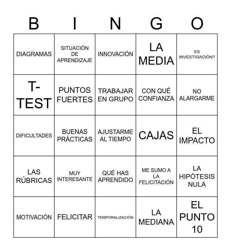 This bingo card has a free space and 24 words: MUY INTERESANTE, FELICITAR, TRABAJAR EN GRUPO, MOTIVACIÓN, ES INVESTIGACIÓN?, DIAGRAMAS, T-TEST, SITUACIÓN DE APRENDIZAJE, CAJAS, QUÉ HAS APRENDIDO, CON QUÉ CONFIANZA, DIFICULTADES, ME SUMO A LA FELICITACIÓN, LA HIPÓTESIS NULA, PUNTOS FUERTES, LA MEDIANA, EL IMPACTO, INNOVACIÓN, NO ALARGARME, BUENAS PRÁCTICAS, EL PUNTO 10, LAS RÚBRICAS, LA MEDIA and TEMPORALIZACIÓN.