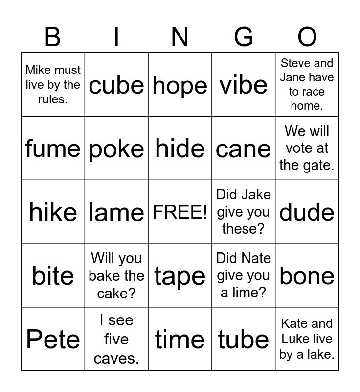 This bingo card has a free space and 24 words: Will you bake the cake?, I see five caves., hide, Pete, Steve and Jane have to race home., Mike must live by the rules., fume, cube, Did Jake give you these?, tape, cane, hike, Did Nate give you a lime?, bone, poke, tube, dude, hope, We will vote at the gate., lame, Kate and Luke live by a lake., bite, vibe and time.