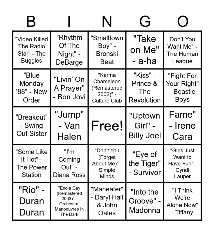 This bingo card has a free space and 50 words: "Holiday" - Madonna, "I Think We're Alone Now" - Tiffany, "I Wanna Dance with Somebody (Who Loves Me)" - Whitney Houston, "Maneater" - Daryl Hall & John Oates, "I'm Coming Out" - Diana Ross, "Cruel Summer" - Bananarama, "Rhythm Of The Night" - DeBarge, "Tainted Love (Remastered 2008)" - Soft Cell, "Blue Monday '88" - New Order, "Don't Leave Me This Way (feat. Sarah Jane Morris)" - The Communards, "Livin' On A Prayer" - Bon Jovi, "Take on Me" - a-ha, "Girls Just Want to Have Fun" - Cyndi Lauper, "Eye of the Tiger" - Survivor, "The Final Countdown" - Europe, "Sweet Dreams (Are Made of This)" - Eurythmics, "Karma Chameleon (Remastered 2002)" - Culture Club, "Uptown Girl" - Billy Joel, "Rebel Yell" - Billy Idol, Don't You Want Me" - The Human League, "Jump" - Van Halen, "Into the Groove" - Madonna, "Video Killed The Radio Star" - The Buggles, "Kiss" - Prince & The Revolution, "Let's Dance" - David Bowie, "You Spin Me Round (Like a Record)" - Dead Or Alive, "Fight For Your Right" - Beastie Boys, "Need You Tonight" - INXS, "Smalltown Boy" - Bronski Beat, "Don't You (Forget About Me)" - Simple Minds, "Ain't Nobody" - Rufus & Chaka Khan, "Relax" - Frankie Goes To Hollywood, "Kids In America" - Kim Wilde, "Word Up" - Cameo, "Enola Gay (Remastered 2003)" - Orchestral Manoeuvres In The Dark, "Together In Electric Dreams" - Philip Oakey & Giorgio Moroder, "It's a Sin" - Pet Shop Boys, "Physical" - Olivia Newton-John, "Just Can't Get Enough" - Depeche Mode, Fame" - Irene Cara, "The Heat Is On" - Glenn Frey, "I'm Free (Heaven Helps the Man)" - Kenny Loggins, "The Look Of Love, Pt.1" - ABC, "Manic Monday" - The Bangles, "Rio" - Duran Duran, "Breakout" - Swing Out Sister, "It Takes Two" - Rob Base & DJ EZ Rock, "A Little Respect" - Erasure, "Some Like It Hot" - The Power Station and "Girls on Film" - Duran Duran.