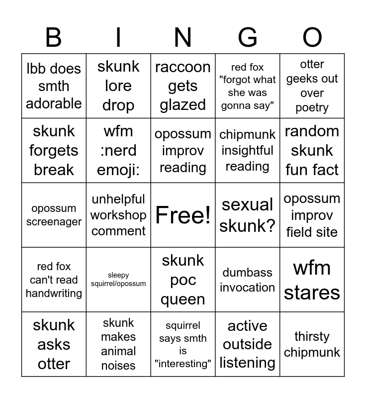 This bingo card has a free space and 24 words: sleepy squirrel/opossum, skunk makes animal noises, opossum improv reading, skunk asks otter, otter geeks out over poetry, lbb does smth adorable, skunk forgets break, skunk lore drop, sexual skunk?, skunk poc queen, chipmunk insightful reading, opossum screenager, dumbass invocation, wfm stares, wfm :nerd emoji:, active outside listening, opossum improv field site, raccoon gets glazed, random skunk fun fact, unhelpful workshop comment, thirsty chipmunk, red fox can't read handwriting, red fox "forgot what she was gonna say" and squirrel says smth is "interesting".