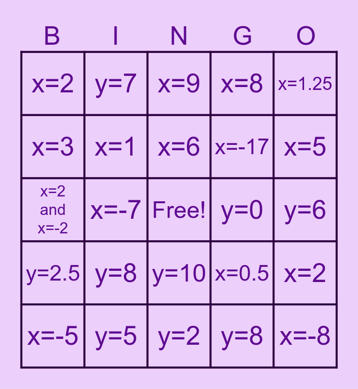 This bingo card has a free space and 34 words: x=2.33, y=8, x=4, x=-3, y=2.5, x=1, x=1.25, x=-5, y=7, x=7, x=6, x=9, y=3, x=-4, y=0, x=5, y=5, x=2 and x=-2, y=8, x=0.5, y=10, x=3 and x=-3, x=2, y=6, y=2, x=-8, x=8, x=1, x=-17, x=3, x=6, x=-7, x=2 and y=0.