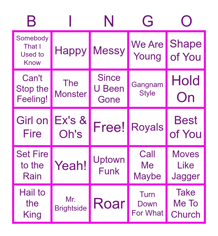 This bingo card has a free space and 24 words: Yeah!, Mr. Brightside, Since U Been Gone, Hail to the King, Shape of You, Somebody That I Used to Know, Can't Stop the Feeling!, Happy, Royals, Uptown Funk, Gangnam Style, Girl on Fire, Call Me Maybe, Moves Like Jagger, The Monster, Turn Down For What, Best of You, Messy, Hold On, Ex's & Oh's, Take Me To Church, Set Fire to the Rain, We Are Young and Roar.
