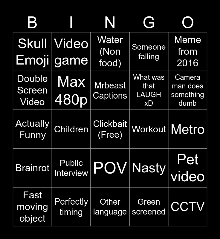 This bingo card has a free space and 37 words: Perfectly cut scream, Any Watermark, Text on screen, Max 480p, Pet video, Public Interview, Mrbeast Captions, Food, Meme from 2016, Stock sound effect, Children, Someone falling, CCTV, Metro, Double Screen Video, Brainrot, What just happened, Water (Non food), POV, Workout, Skull Emoji, Camera man does something dumb, Fast moving object, Other language, Low quality meme, Green screened, Video game, Faces, Dumb people, NPC, Prank, Perfectly timing, Actually Funny, Actually Sad, Nasty, What was that LAUGH xD and Instant Karma.