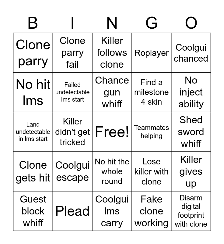 This bingo card has a free space and 24 words: Coolgui escape, Plead, Chance gun whiff, Guest block whiff, Coolgui chanced, Clone parry, No hit lms, Clone parry fail, Teammates helping, No hit the whole round, Find a milestone 4 skin, Land undetectable in lms start, Lose killer with clone, Killer gives up, Failed undetectable lms start, Fake clone working, Shed sword whiff, Killer follows clone, No inject ability, Killer didn't get tricked, Disarm digital footprint with clone, Clone gets hit, Roplayer and Coolgui lms carry.