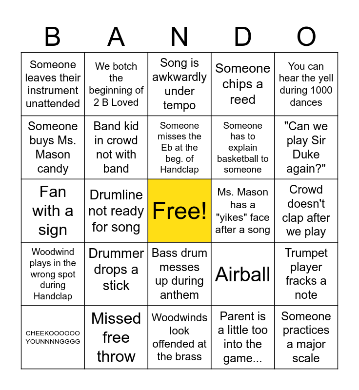 This bingo card has a free space and 65 words: Someone drops their instrument, Trombones not loud enough, Band gets off from the drums, Trumpet player fracks a note, Clarinet player looks lost, Nathan S requests a song, We botch the beginning of 2 B Loved, We nail the beginning of 2 B Loved, Someone misses the Eb at the beg. of Handclap, We rush the school song, Bass drum messes up during anthem, Crowd claps after we play, Crowd doesn't clap after we play, You can hear the yell during 1000 dances, People leave to get food, Someone buys Ms. Mason candy, Drumline not ready for song, Someone leaves their instrument unattended, Mr. Scalise roasts someone, Someone has to explain basketball to someone, Drummer drops a stick, Woodwind plays in the wrong spot during Handclap, Someone chips a reed, Someone wearing AV band attire, Rhythm at beg. of X&Os not together, "I hate this song", "I love this song", Student section does something questionable, Someone practices a major scale, Someone squeaks, CHEEKOOOOOO YOUNNNNGGGG, Angry bball parent, Coach yells angrily, Cheerleader doesn't know choreo, Airball, Missed free throw, Upset fan, Fan with a sign, Parent is a little too into the game..., Someone sings/hums one of the songs we play, Band kid in crowd not with band, Someone doesn't shout the shouting parts, Ms. Mason has a "yikes" face after a song, Someone drinking not water while playing instrument, We clap for ourselves, Someone spills food on their white clothes, "Can we play Sir Duke again?", Athlete falls flat on the ground or pretends to be hurt, Saxophone plays careless whisper but wrong, Someone forgot something at school, Someone asks to hold the sign for a song, Someone plays a song while around the wrong section, Annika yells at a ref during the game, Woodwinds look offended at the brass, Jayden hits a screamer, Freshman looks lost, We play a song a little too fast for comfort, Song is awkwardly under tempo, Someone didn't put the new shorties in their flip folder, Someone misses an entrance, Someone doesn't wear white, Someone played on a rest and everyone knew, Questionable concession stand choice, Someone asks to go to the bathroom and Someone forgot something in the band room.