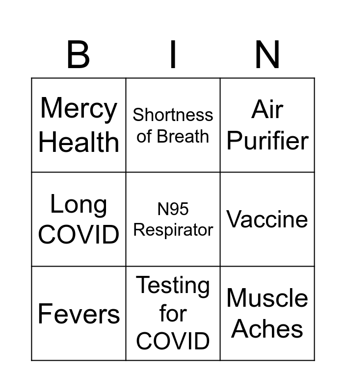 This bingo card has 9 words: Fevers, N95 Respirator, Air Purifier, Mercy Health, Shortness of Breath, Vaccine, Long COVID, Testing for COVID and Muscle Aches.