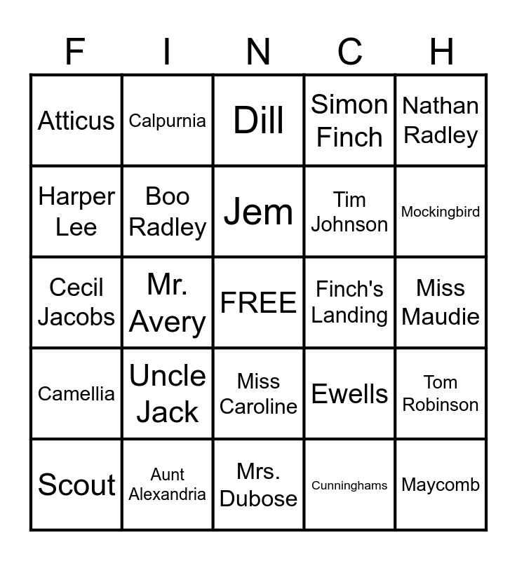 This bingo card has a free space and 24 words: Uncle Jack, Aunt Alexandria, Jem, Scout, Nathan Radley, Atticus, Harper Lee, Calpurnia, Finch's Landing, Miss Caroline, Tim Johnson, Cecil Jacobs, Ewells, Tom Robinson, Boo Radley, Cunninghams, Miss Maudie, Dill, Mockingbird, Mr. Avery, Maycomb, Camellia, Simon Finch and Mrs. Dubose.