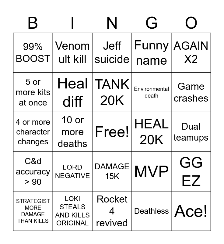 This bingo card has a free space and 24 words: LORD NEGATIVE, LOKI STEALS AND KILLS ORIGINAL, TANK 20K, STRATEGIST MORE DAMAGE THAN KILLS, AGAIN X2, 99% BOOST, 5 or more kits at once, Venom ult kill, HEAL 20K, DAMAGE 15K, Environmental death, 4 or more character changes, MVP, GG EZ, Heal diff, Deathless, Dual teamups, Jeff suicide, Game crashes, 10 or more deaths, Ace!, C&d accuracy > 90, Funny name and Rocket 4 revived.