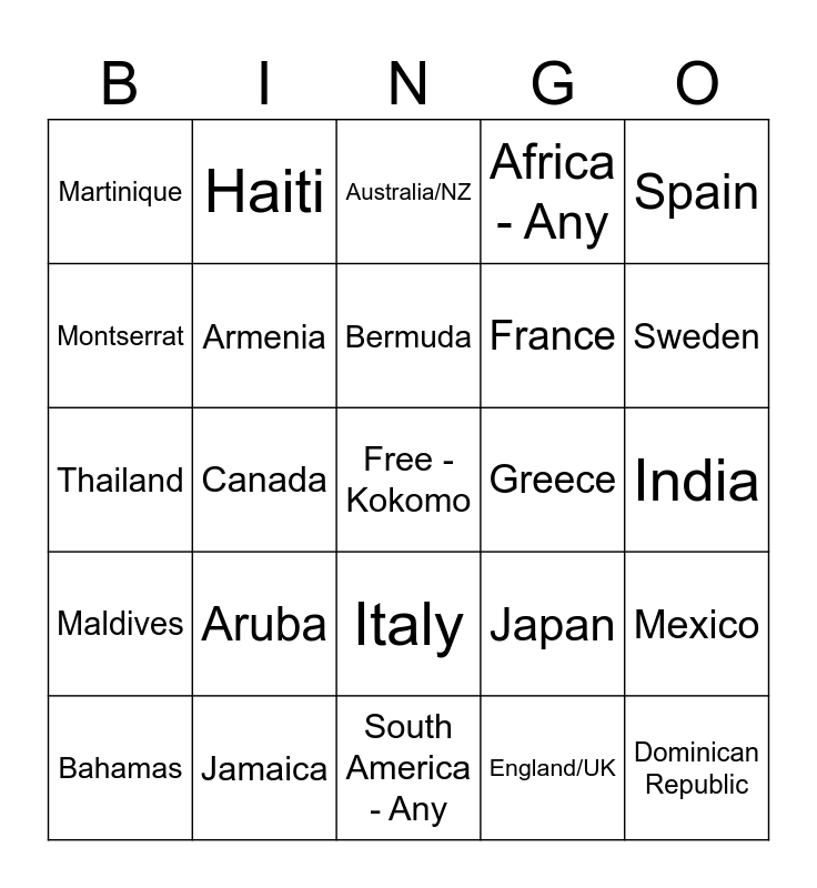 This bingo card has a free space and 24 words: Aruba, Jamaica, Bermuda, Bahamas, Spain, Martinique, Montserrat, Haiti, Greece, Italy, France, Thailand, Japan, Mexico, Armenia, England/UK, India, Australia/NZ, Sweden, Canada, Dominican Republic, Maldives, Africa - Any and South America - Any.