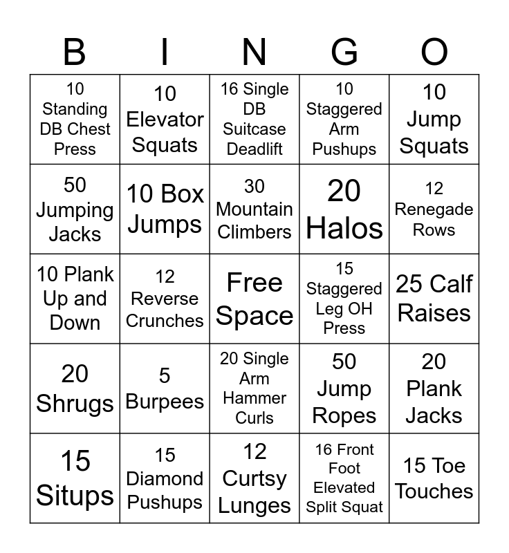 This bingo card has a free space and 24 words: 5 Burpees, 15 Diamond Pushups, 30 Mountain Climbers, 15 Situps, 10 Jump Squats, 10 Standing DB Chest Press, 50 Jumping Jacks, 10 Elevator Squats, 15 Staggered Leg OH Press, 20 Single Arm Hammer Curls, 20 Halos, 10 Plank Up and Down, 50 Jump Ropes, 20 Plank Jacks, 10 Box Jumps, 16 Front Foot Elevated Split Squat, 25 Calf Raises, 16 Single DB Suitcase Deadlift, 12 Renegade Rows, 12 Reverse Crunches, 15 Toe Touches, 20 Shrugs, 10 Staggered Arm Pushups and 12 Curtsy Lunges.