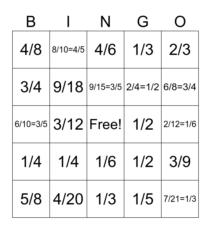 This bingo card has a free space and 27 words: 1/2, 2/6, 2/4=1/2, 1/3, 3/4, 4/6, 8/10=4/5, 1/4, 1/2, 3/9, 6/10=3/5, 1/3, 5/8, 4/20, 6/8=3/4, 1/5, 9/18, 9/15=3/5, 1/4, 4/8, 2/12=1/6, 1/5, 3/12, 7/21=1/3, 1/6, 2/3 and 3/9.